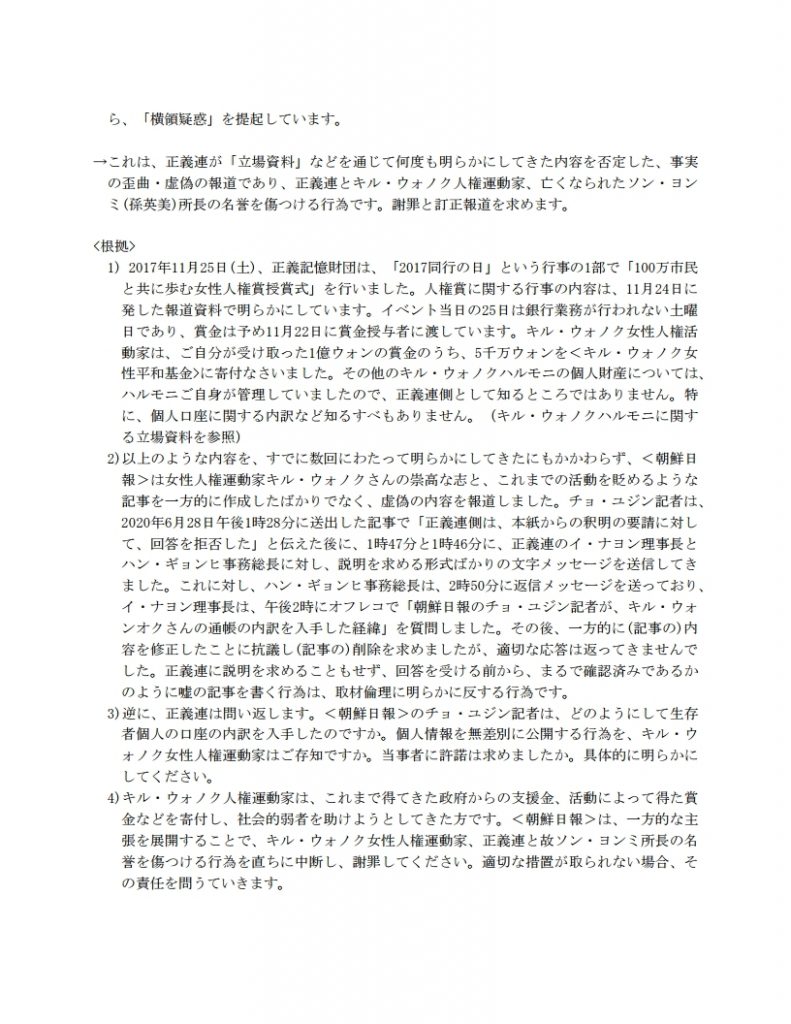 言論調停申請書の第2次提出に関する正義記憶連帯の立場