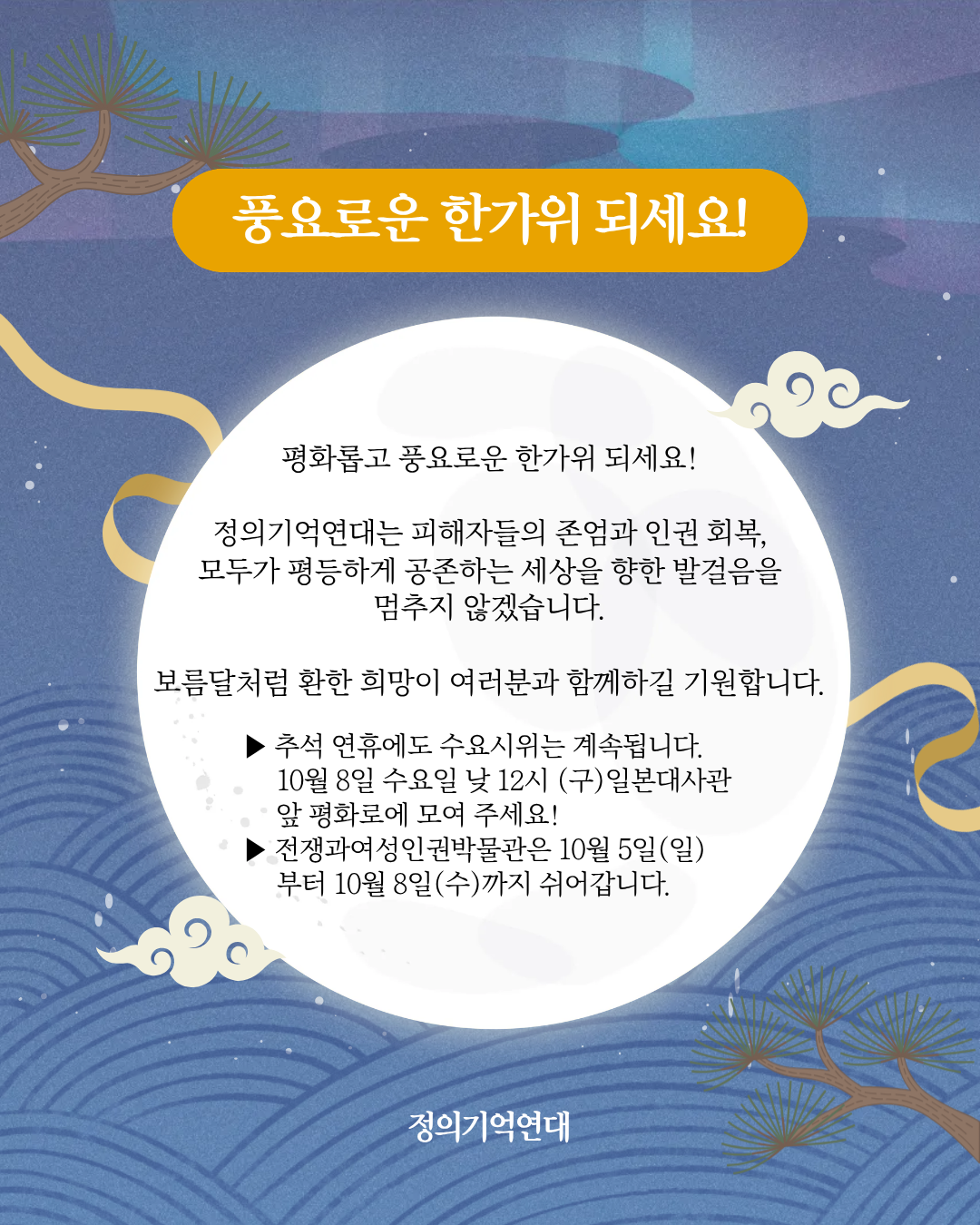 추석 연휴에도 수요시위는 계속됩니다. 10월 8일 수요일 낮 12시 (구)일본대사관 앞 평화로에 모여 주세요!