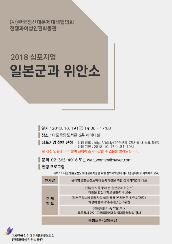2018 심포지엄 ‘일본군과 위안소’ 참여 신청 안내 (사)한국정신대문제대책협의회와 전쟁과여성인권박물관은 오는 10월 19일, ‘일본군과 위안소’라는 주제로 국내 심포지엄을 개최합니다. 일본군성노예제 문제에 대한 진실을 부정하는 이들과 진실을 알리기 위한 이들이 공존하고 있는 오늘날, 역사적 사료와 일본군성노예 피해자들의 삶을 통해 일본군'위안소'제도의 진실을 알리고 더불어 일본군성노예제 문제를 잊지 않고 우리 모두 올바르게 기억하기 위해, 이번 심포지엄을 개최하오니 여러분의 많은 참여와 관심 부탁드립니다. 【 2018 심포지엄 ‘일본군과 위안소’ 진행 안내】 1. 일시 : 2018.10.19. (금) 오후 2시 – 오후 5시 2. 장소 : 마포중앙도서관 6층 세미나실 └ 위치 : 서울특별시 마포구 성산로 128 3. 문의 : 02-365-4016 또는 war_women@naver.com ★심포지엄 참여 신청 http://bit.ly/2PPp5fj (신청 기한 : ~ 2018. 10. 17 수 오전 10시) ※ 신청 인원에 따라 참여 신청이 조기 마감될 수 있음을 알려드립니다.
