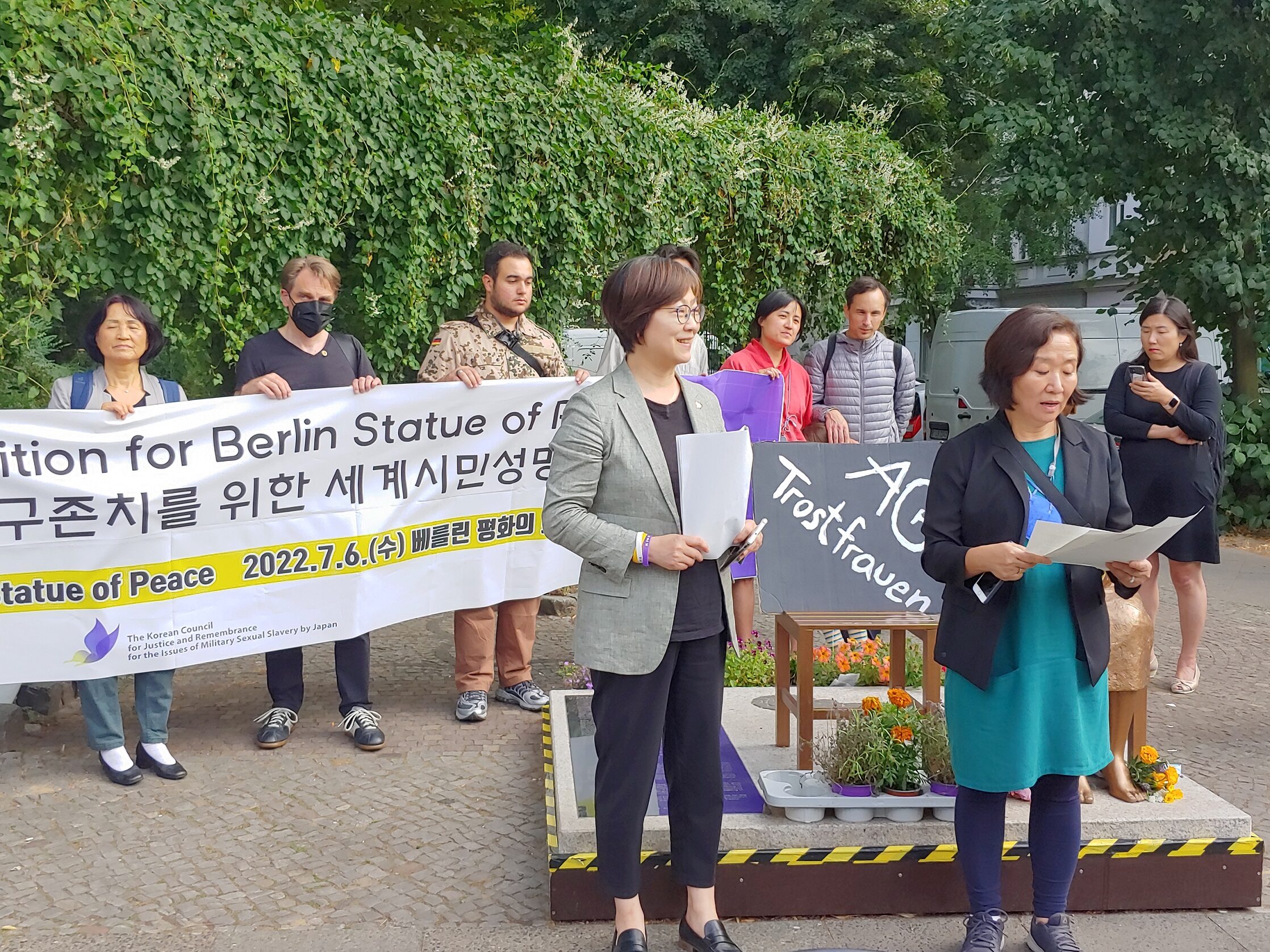 2. 독일 베를린 평화의 소녀상 영구존치를 위해 독일을 방문 중인 이나영 정의기억연대 이사장은 7월 6일, 오후 6시(현지시간) 독일 베를린 평화의 소녀상 앞에서 코리아협의회와 수요시위를 진행하였습니다. 미테구 Lela Sisauri 구의원(녹색당), Ingrid Bertermann 구의원(좌파당), 독일 시민단체 ‘오마스 게겐 레히츠’(극우에 반대하는 할머니들: OMAS GEGEN RECHTS. Berlin), 한민족유럽연대, AG(일본군'위안부' 액션그룹), 재독한국여성모임, 코리아협의회 회원 등 50여 명의 사람들이 인종과 국적, 성별과 세대를 넘어 수요시위에 참가했습니다.