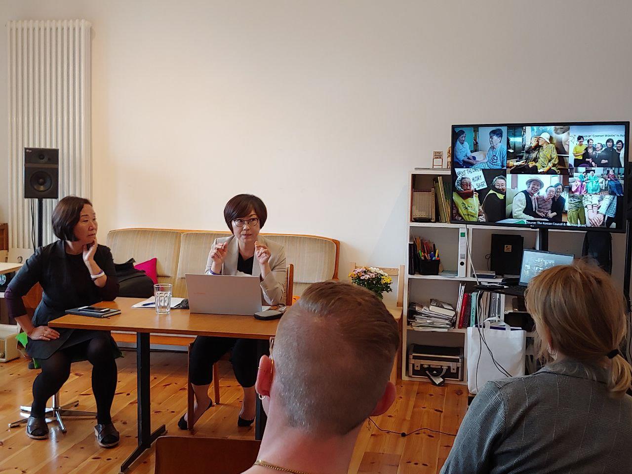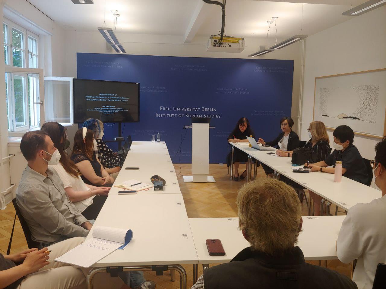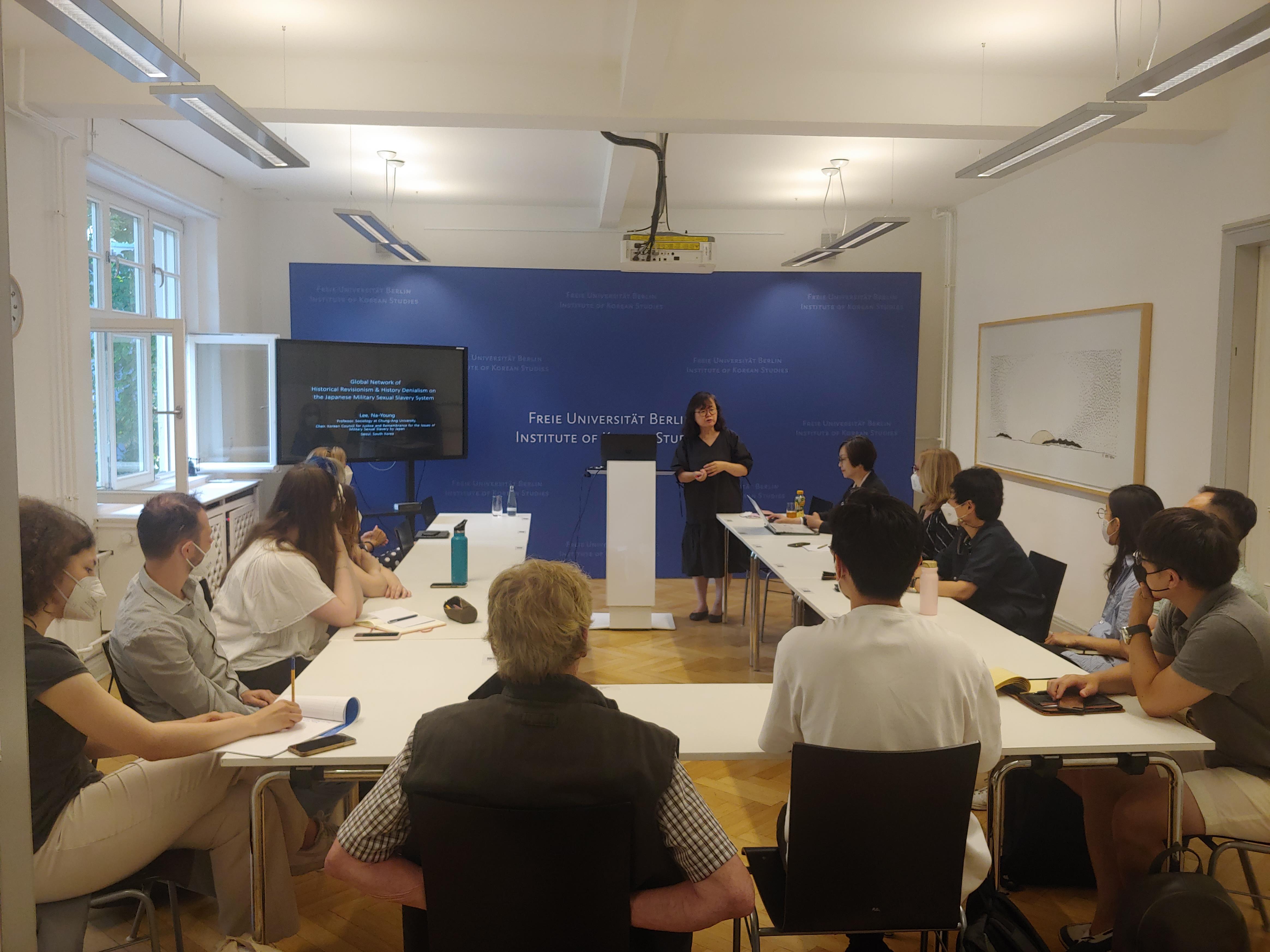 6. 그밖에 정의연 이나영 이사장은 베를린 소재 대학 연구자들과 학생들을 대상으로 두 차례 강연을 진행했습니다. 먼저 5일 오후 5시, 베를린 자유대학교 한국학연구소장 이은정 교수의 초청으로 한국학 및 젠더 관련 대학원생과 연구자들을 대상으로 “Special Talk - War and Women. The long and sad History” 강연을 진행해 한국 수요시위 상황과 확장되고 있는 글로벌 역사부정 세력에 대해 이야기를 나누었습니다. 7일 정오에는 코리아협의회 Museum der Trostfraue에서 “Reconfiguring Activist-Survivors of Japanese Military Sexual Slavery, Remapping Encounters between Colonial Women”이라는 제목으로 강연을 진행했습니다. 훔볼트대학교 동남아시아 학과 학생들과 교수, 라이프치히대학교 슈테피 리히터 일본학 교수 등 다수의 연구자들도 함께 했습니다.