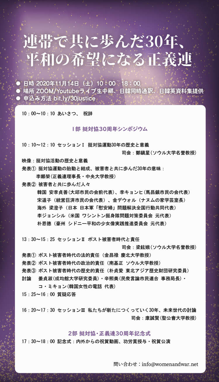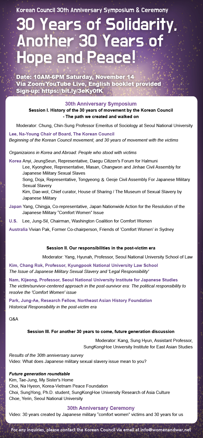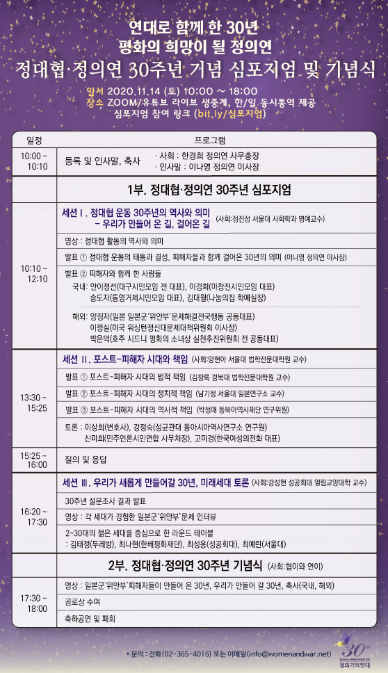 2. 정의기억연대(이사장 이나영, 이하 정의연)는 한국정신대문제대책협의회와 일본군성노예제 문제해결을 위한 운동 30주년을 맞아 오는 11월 14일(토) 10시부터 18시까지 정대협 30주년 기념 심포지엄 및 기념식을 ZOOM으로 개최합니다.