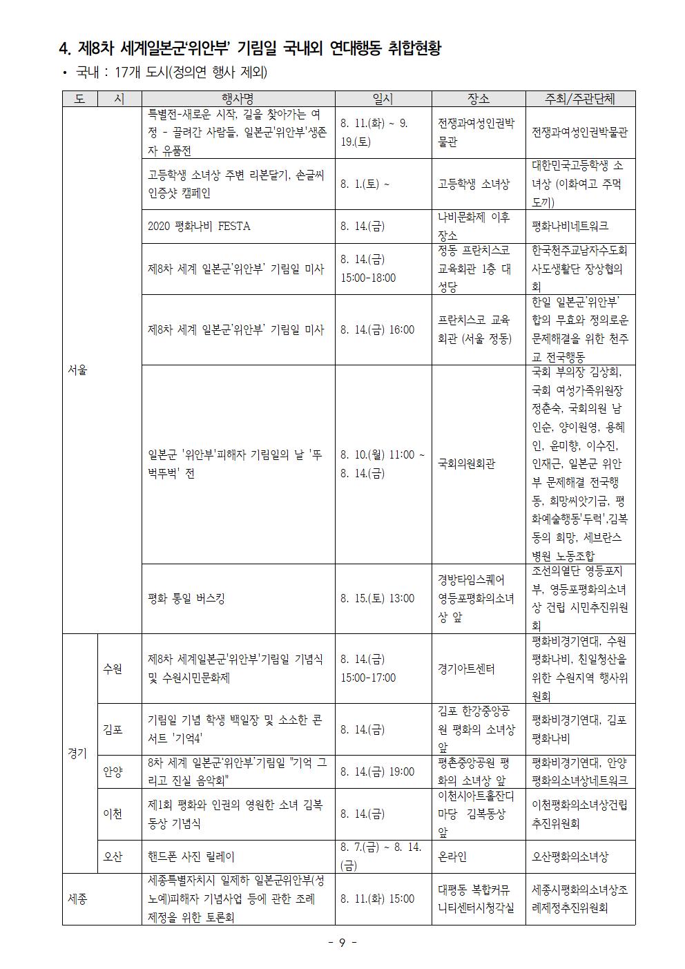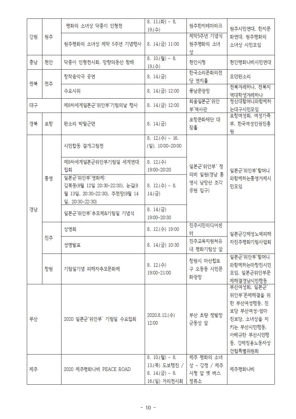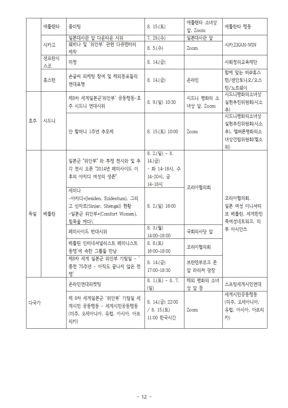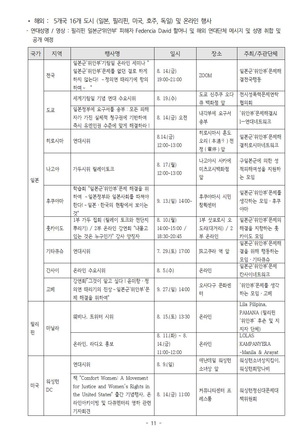 “그녀들의 말하기, 우리가 ∞ 영원히 기억한다! ∞ 끝없이 공명한다! ∞ 무한대로 확장한다!” 11개국 33개도시 및 온라인에서 제8차 세계일본군‘위안부’기림일 행사 개최! 1. 정론보도를 위해 노력하는 귀 언론사의 노고에 감사드립니다. 2. 1991년 8월 14일, 김학순 할머니는 반세기 동안 숨죽여 살아 온 침묵과 고통의 역사를 깨고 국내 최초 공개 증언을 통해 일본군‘위안부’ 피해사실을 세상에 당당히 알렸습니다. 할머니의 용기 있는 행동은 남북을 넘어 아시아태평양 지역의 수많은 피해자들의 증언을 이끌었습니다. 3. 이날을 기려 2012년 제11차 아시아연대회의 참가자들은 매년 8월 14일을 세계일본군‘위안부’기림일로 지정하였습니다. 한국 정부도 2018년부터 기림일을 국가기념일로 지정하였습니다. 올해는 일본군‘위안부’문제의 정의로운 해결을 위한 운동을 시작한 지 30주년이 되는 해이자 8번째 기림일을 함께 맞이하는 해입니다. 이번 8차 기림일 주제는 “그녀들의 말하기, 우리가 ∞ 영원히 기억한다! ∞ 끝없이 공명한다! ∞ 무한대로 확장한다!”입니다. 4. 8월 12일(수) 12시에 평화로에서 11개국 118개의 공동주관단체들과 함께 세계연대집회 기자회견을 개최할 예정입니다. 기자회견에서 정의기억연대는 최근 ‘성찰과 비전위원회’에서 논의된 정의연의 향후 나아갈 방향을 발표할 예정입니다. 국내와 해외의 연대 영상메시지 상영 및 학생과 단체의 연대발언이 예정되어 있습니다. 5. 8월 14일(금) 저녁 7시에는 정의연과 평화예술행동 두럭, 평화나비네트워크가 공동주관하여 기림일 나비문화제를 개최할 예정입니다. 최광기 정의연 홍보대사의 사회로 오프닝 퍼포먼스와 합창 공연, 모두가 함께 끈을 묶어 무한대를 상징하는 퍼포먼스, 대금연주, 영상 상영 등 다양한 문화공연과 함께 미래세대들의 연대 발언이 있을 예정입니다. 6. 사전캠페인으로 바위처럼틱톡챌린지(해시태그 #바위처럼챌린지)를 진행하고 김학순, 황금주, 강덕경, 김복동, 이용수, 길원옥, 박영심, 송신도, 얀 루프 오헤른 등 할머니의 말씀 중 어떤 것을 기억하고 싶은지를 쓰는 손글씨 인증샷 캠페인을 진행하였습니다. 또한 기림일을 맞이하여 <일본군성노예제문제해결을 위한 A to Z 가이드> 영문자료집을 8월 안에 인쇄, 배포할 예정입니다. 7. 미래세대와 한국, 그리고 세계시민들이 30년 전 할머니들의 미투에 응답하며, 이제는 우리가 또 다른 ‘김학순’이 되어 더 넓은 울림으로 퍼지면서, 일본군‘위안부’문제의 정의로운 해결을 이루어 나가야 할 것입니다. 제8차 세계일본군‘위안부’기림일 기념 세계연대집회 기자회견과 나비문화제가 성공적으로 개최될 수 있도록 많은 관심과 보도 부탁드립니다. ❍ 8. 14.(금) 제8차 세계일본군‘위안부’기림일 나비문화제 시 코로나바이러스감염증-19 확산 방지를 위해 2미터 거리두기로 300개의 좌석을 배치할 예정이며, 참석자 확인을 위해 사전 신청 및 현장 명부작성, 열 측정, 참가자 마스크 착용을 의무화할 예정입니다. (사전신청: https://docs.google.com/forms/d/e/1FAIpQLSdN74ODgCwAOtNoBYsa1XpTmzZzjYX9ph14Fe-8KcOUeVWc9g/viewform) 또한 무대 주변 라인 안쪽과 무대에 올라갈 대표 기자를 사진 1명, 영상 1명으로 한정하는 등 현장 상황에 따라 풀을 구성해야 할 수도 있으니 양해 부탁드립니다. ❍ 문의 : 이메일 info@womenandwar.net 첨부 : 제8차 세계일본군‘위안부’ 기림일 행사 일정 및 행사별 웹자보 각 1부. 2020년 8월 10일 일본군성노예제 문제해결을 위한 정의기억연대