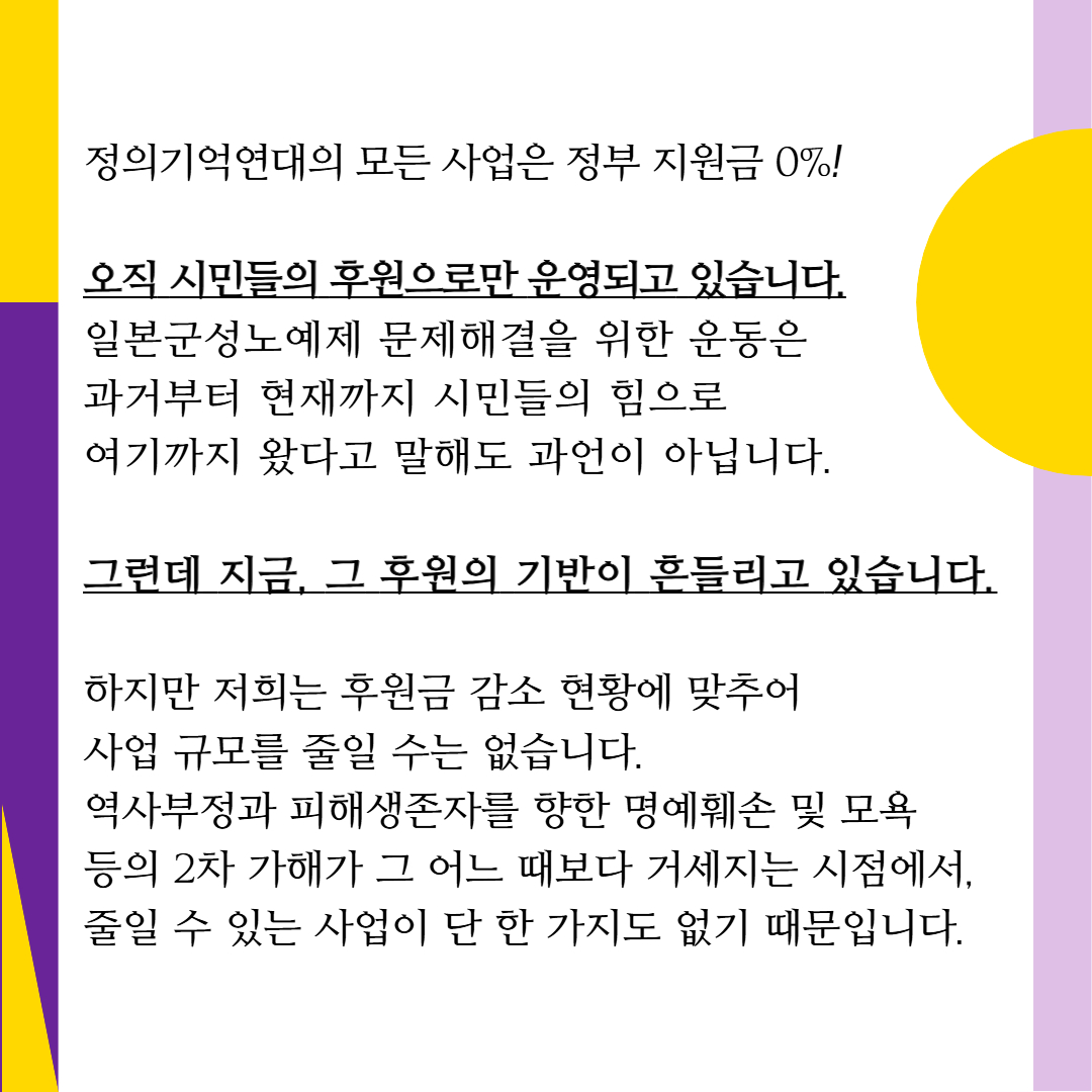 정의기억연대는 이러한 시기에 감소하는 후원금의 규모에 맞추어 사업을 줄일 수가 없습니다.