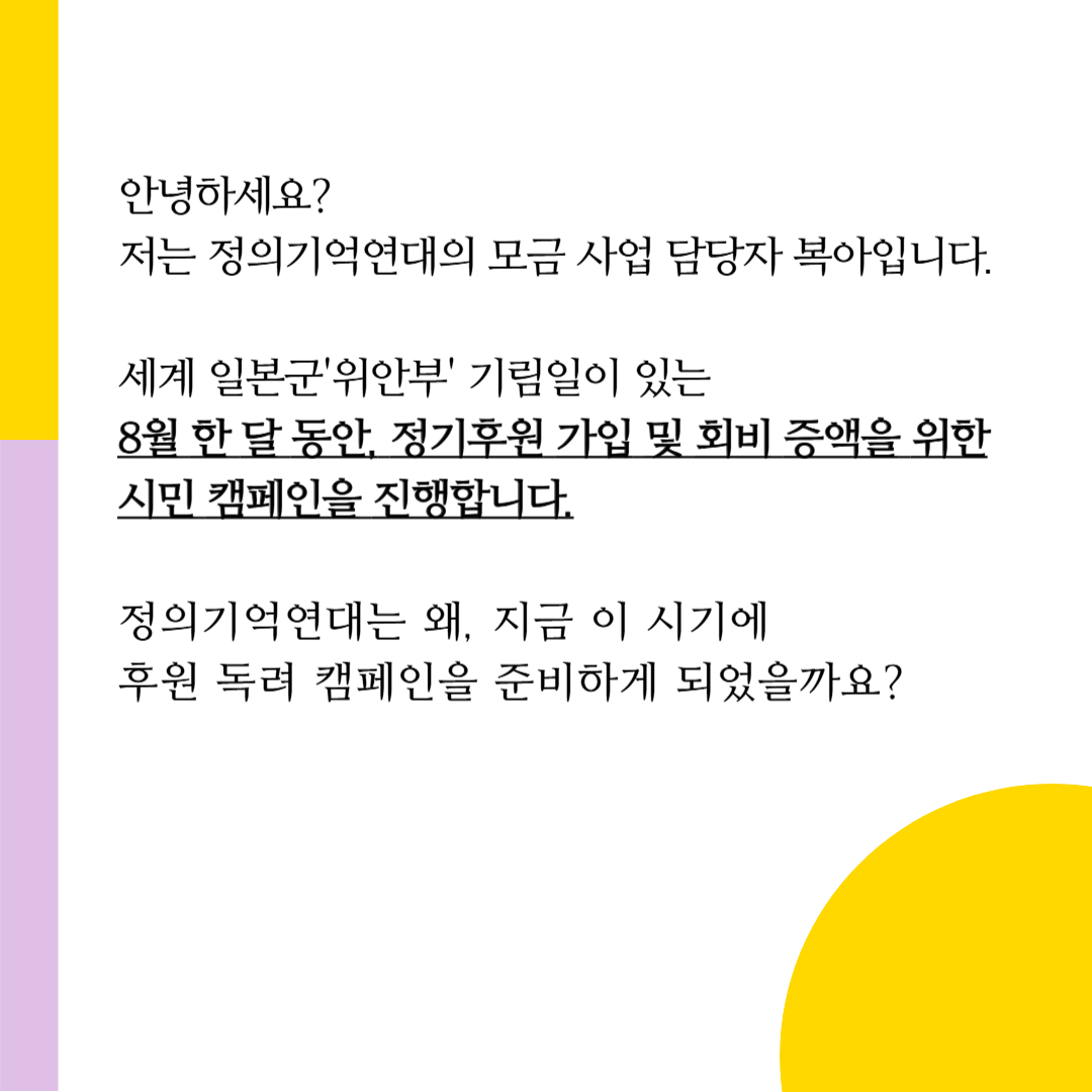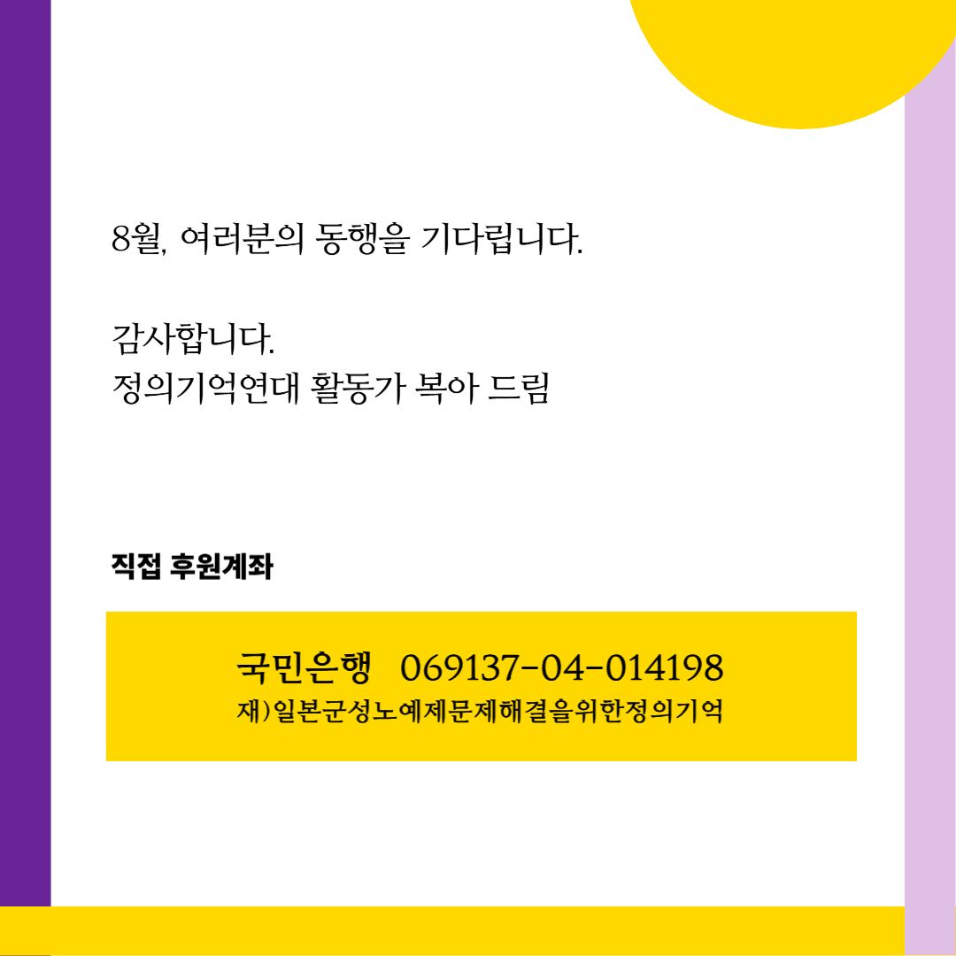세계 일본군'위안부' 기림일이 있는 8월 한 달 동안, 정기후원 가입 및 회비 증액을 위한 시민 캠페인을 진행합니다.