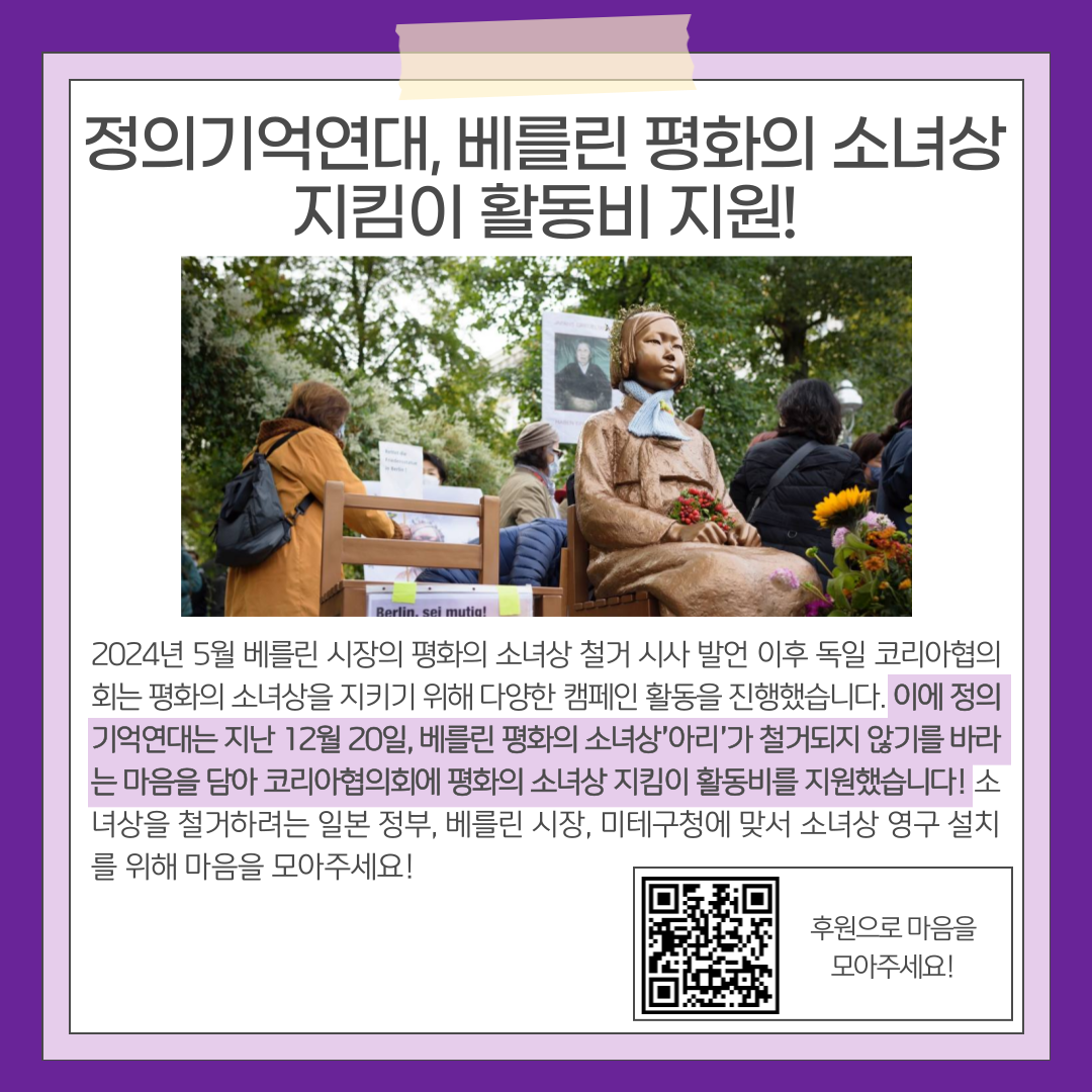 🔸 정의기억연대, 베를린 평화의 소녀상 지킴이 활동비 지원 2020년 9월 28일 정의기억연대는 독일 '코리아협의회'를 비롯한 세계 시민들과 함께 정의와 평화를 염원하며 평화의 소녀상'아리'를 세웠습니다. 지난 2024년 5월 베를린 시장의 평화의 소녀상 철거 시사 발언 이후 정의기억연대는 베를린 평화의 소녀상'아리'를 지키기 위해 코리아협의회에 활동비를 지원했습니다. 역사를 지우려는 일본 정부에 맞서 철거 위기에 놓인 소녀상을 함께 지켜주세요! |
