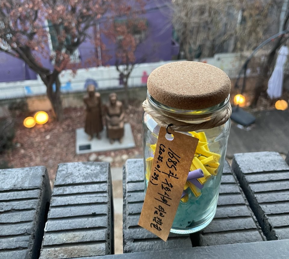 🔸 설날 수요시위를 주관한 전쟁과여성인권박물관 2025년 1월 29일 설날, 제1685차 정기 수요시위를 전쟁과여성인권박물관에서 수요시위 주관했습니다! 순서, 성명서 작성, 연대발언자 조직, 문화공연, 퍼포먼스스까지 모두 박물관 활동가들이 준비했어요! 마지막 퍼포먼스는 참가자들과 타임캡슐을 만들어봤습니다. 타입 캡슐에 2025년에 일본군’위안부’문제해결을 위해 일상에서 할 수 있는 활동’을 적어넣었습니다. 내년 이맘때 확인해볼텐데요! 여러분들이 적어볼 마음 속 일상 활동은 무엇인가요? |