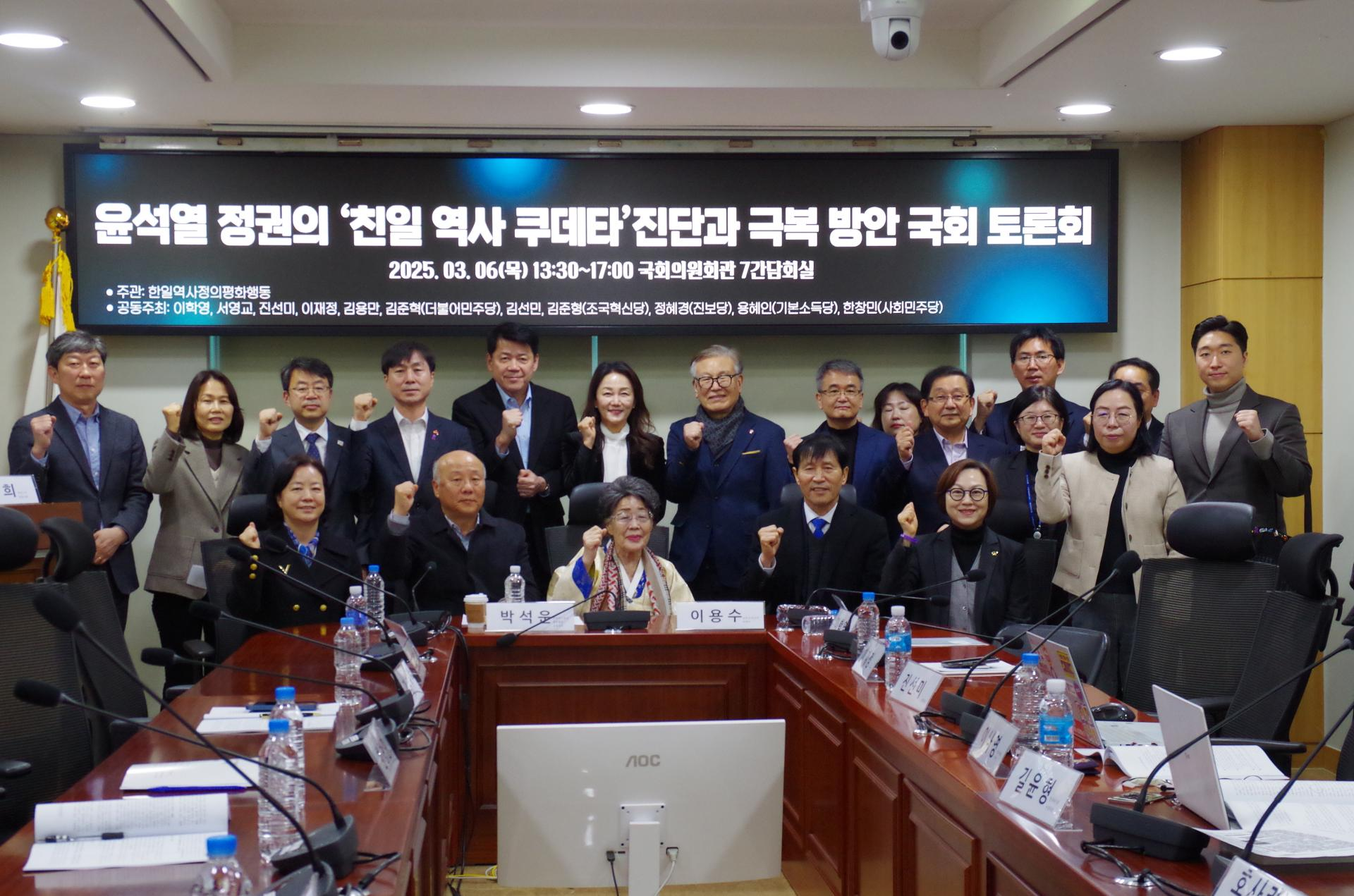 On Thursday, March 6, from 1:30 PM to 5:00 PM, the National Assembly Forum on Diagnosing and Overcoming the Yoon Administration's ‘Historical Coup’ was held in the 7th conference room of the National Assembly. The forum was organized by the Civil Solidarity for Historical Justice and Peaceful Relationship between Korea and Japan, with co-hosts including members of the National Assembly Lee Hak-young, Seo Young-kyo, Jin Sun-mi, Lee Jae-jung, Kim Yong-man, and Kim Jun-hyuk (Democratic Party of Korea), Kim Seon-min and Kim Jun-hyun (Justice for Reform Party), Jeong Hye-kyung (Progressive Party), Yong Hye-in (Basic Income Party), and Han Chang-min (Social Democratic Party). The event was opened with congratulatory remarks from participating members and Lee Yong-soo halmoni.