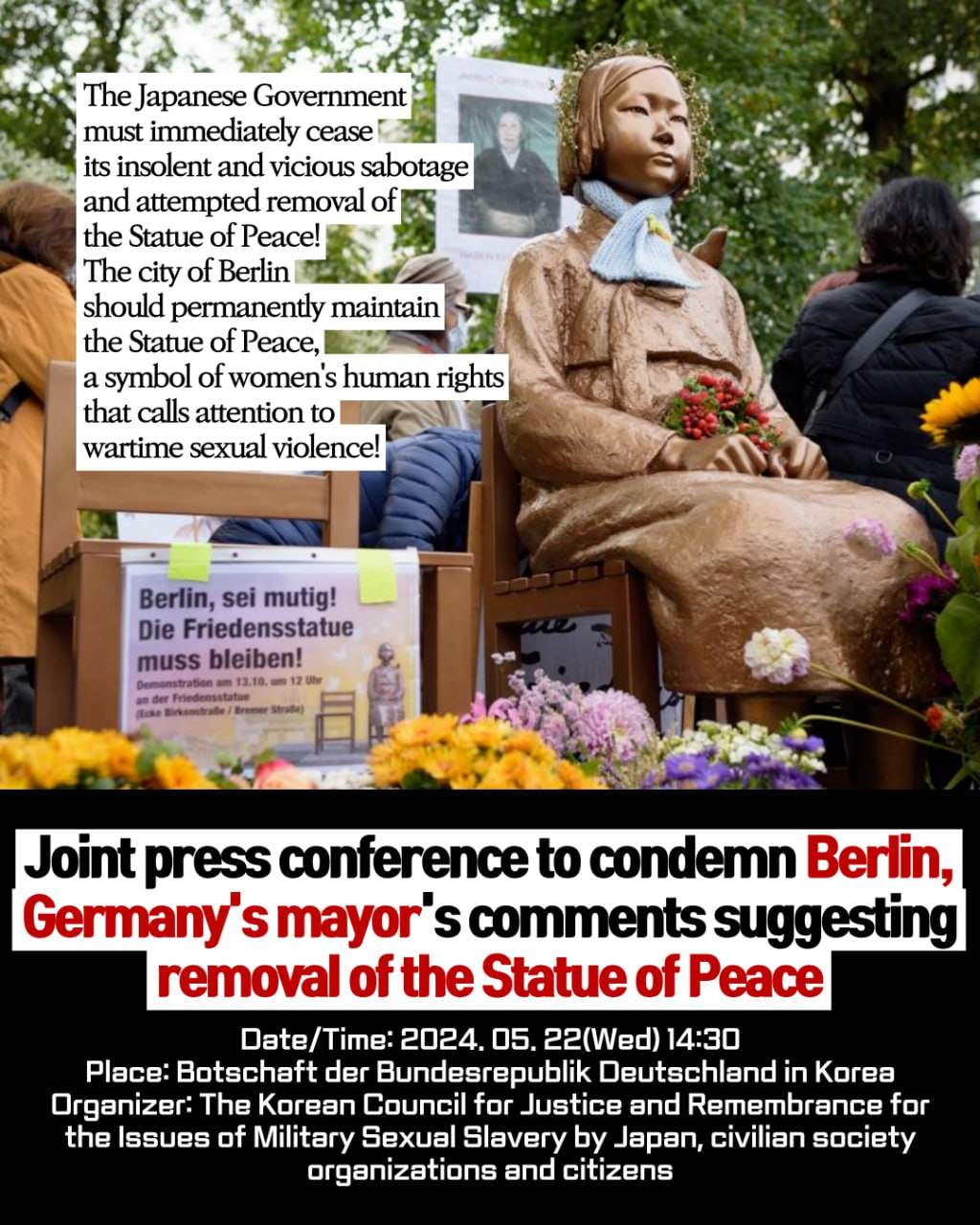 The Japanese Government must immediately cease its insolent and vicious sabotage and attempted removal of the Statue of Peace! The city of Berlin should permanently maintain the Statue of Peace, a symbol of women's human rights that calls attention to wartime sexual violence!
