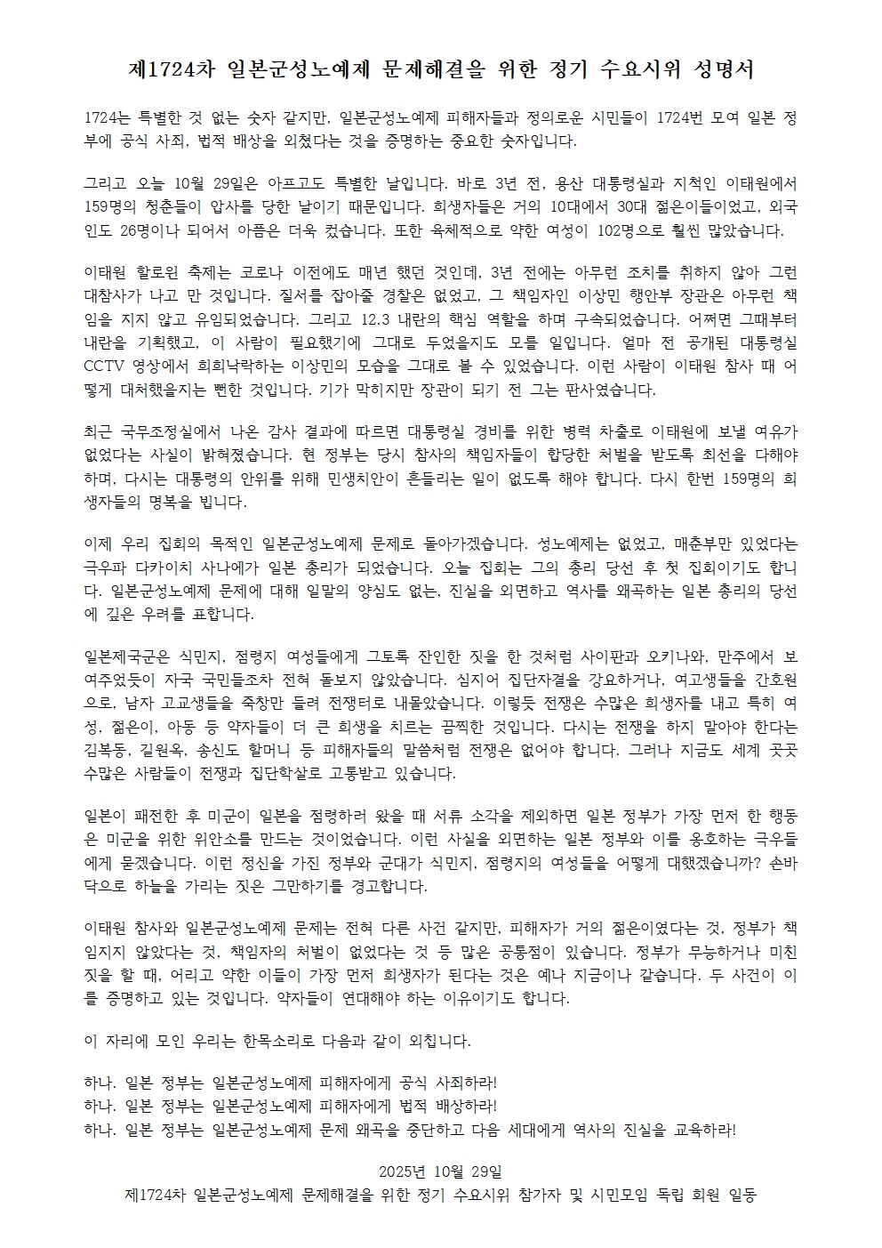 [수요시위 성명서] 1725차