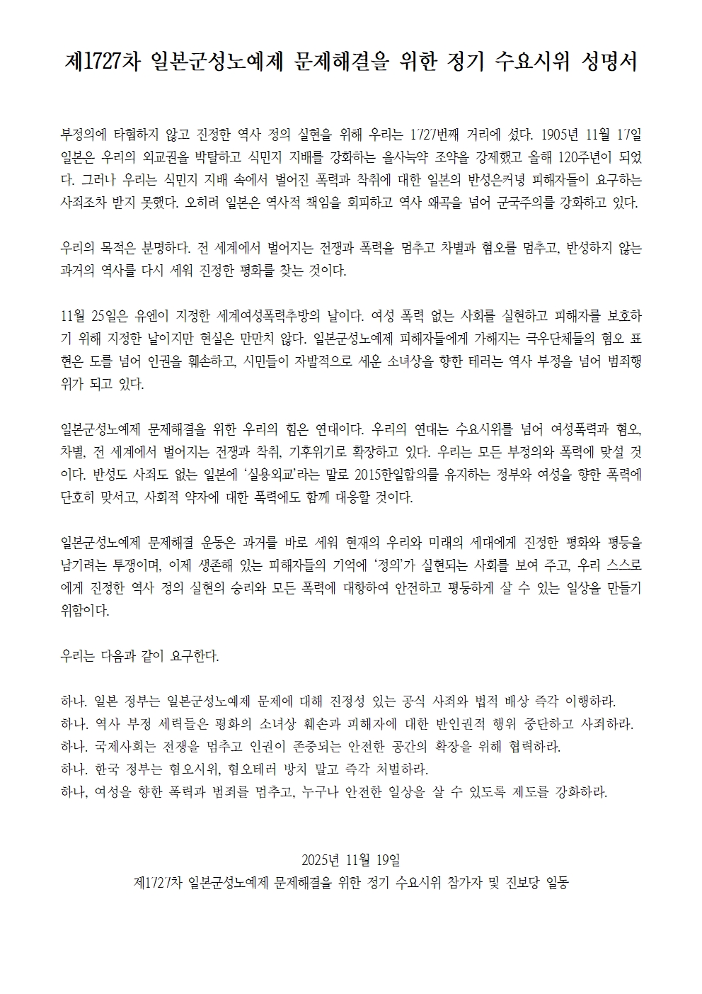 [수요시위 성명서] 1727차