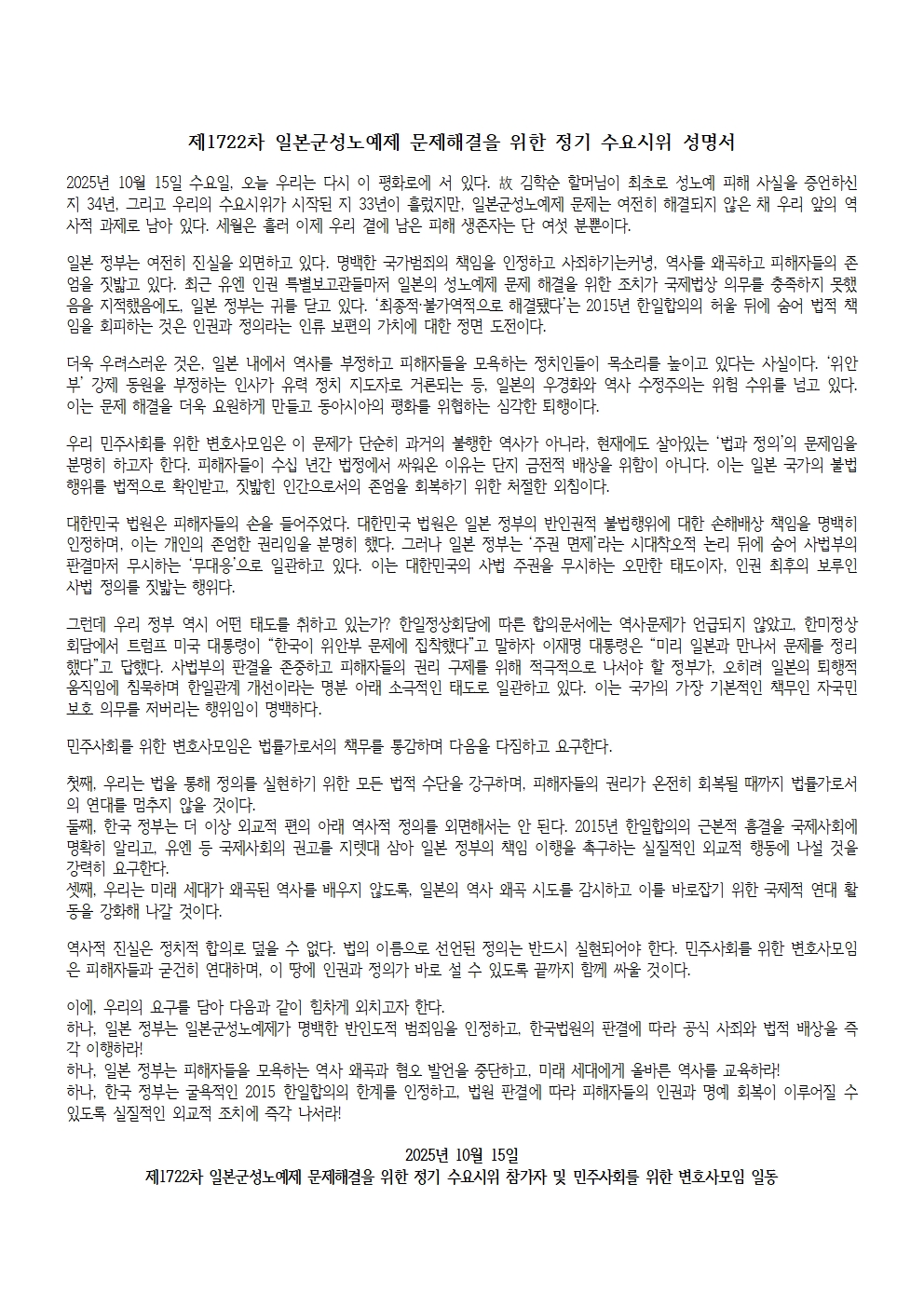 [수요시위 성명서] 1722차